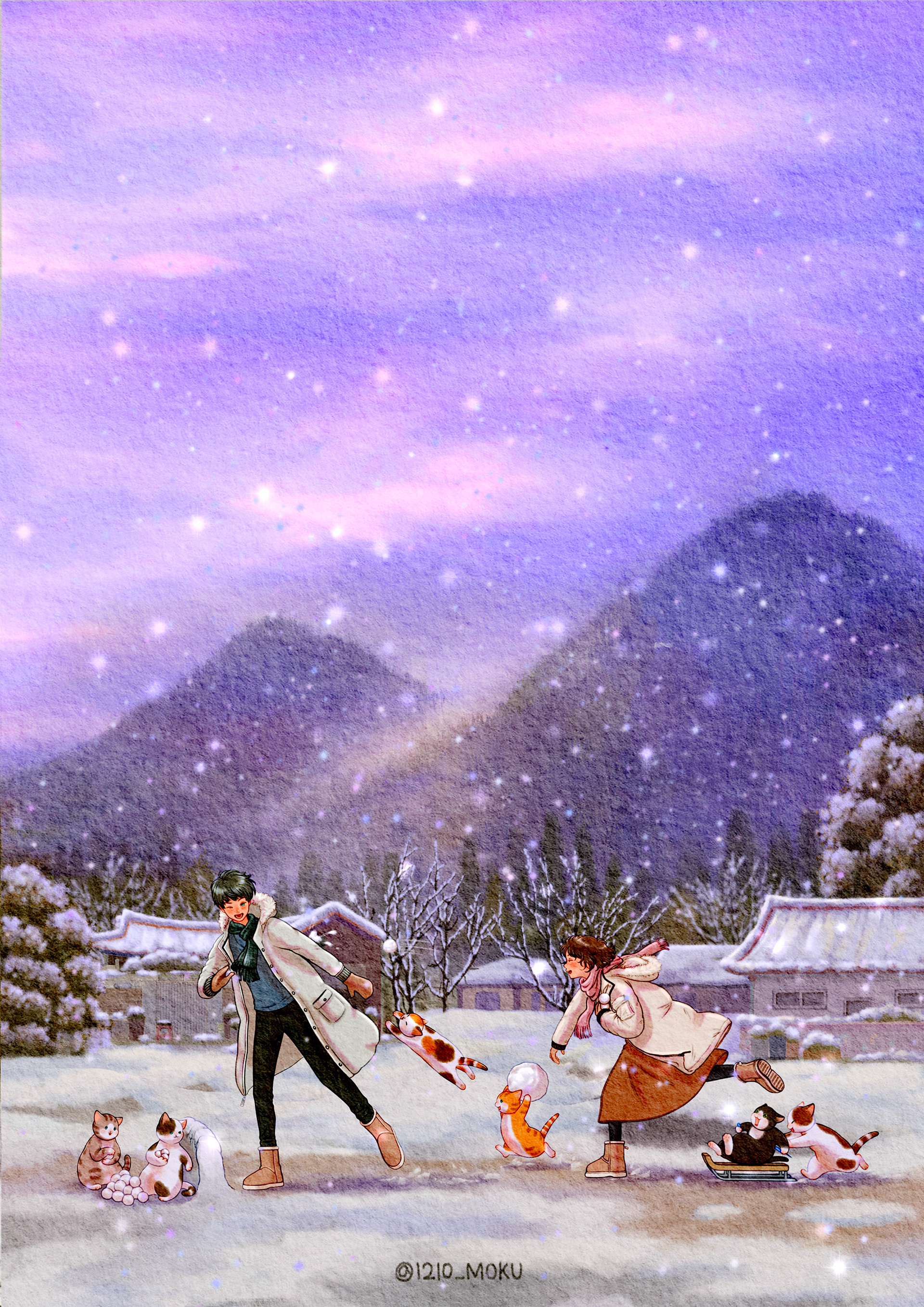 소라, 선우, 그리고 고양이들이 눈이 펑펑 쏟아지는 시골 눈밭에서 눈싸움을 하고 있어요.